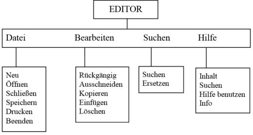Hierarchische Strukturen sind dir schon oft begegnet. Das Inhaltsverzeichnis dieses Buches (das Menü) ist in seiner Anordnung von Kapiteln und Unterkapiteln hierarchisch gegliedert. Auch das Menü einer Anwendersoftware hat eine hierarchische Struktur. Diese kannst du in einem Menübaum darstellen. Ein Beispiel für den Menübaum eines Editors zeigt die Abbildung. |
